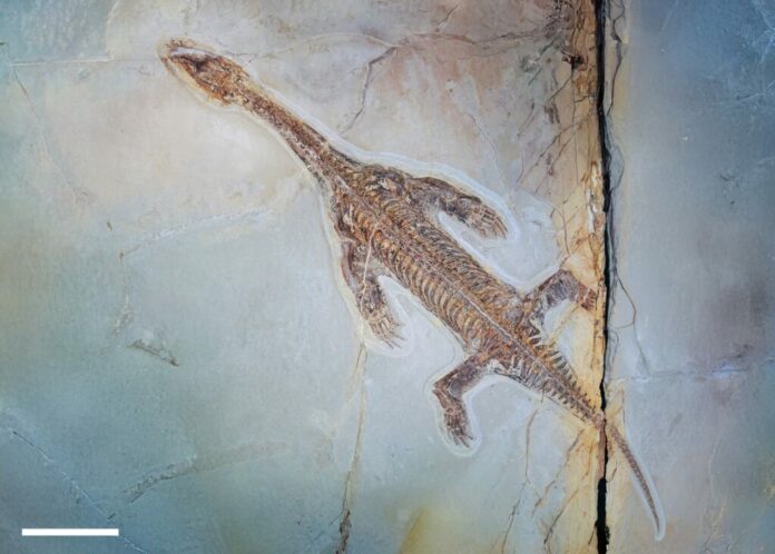 Un articolo pubblicato recentemente sulla rivista scientifica Swiss Journal of Paleontology descrive il ritrovamento di un rettile marino, risalente al Triassico Medio, appartenente al genere Lariosaurus con la pelle conservata. Il fossile è stato scoperto durante le campagne di scavi paleontologici condotte nel 2023 dal Museo cantonale di storia naturale (MCSN) lungo il torrente Gaggiolo, nei pressi di Meride.