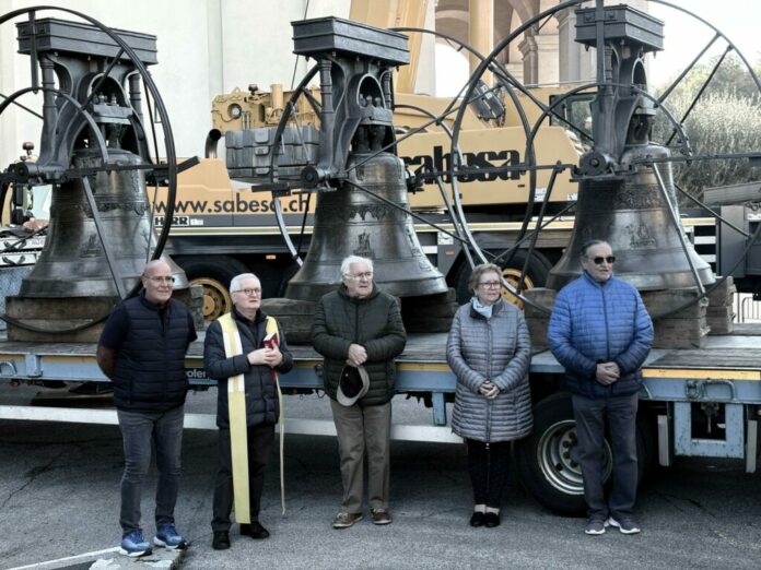 Dopo un mese e mezzo di cure, sono tornati a casa i tre “campanoni” della Parrocchiale di Mendrisio (in totale sono 5). Martedì mattina un nugolo di persone li attendeva e, prima che venissero issati al campanile, l’arciprete don Claudio Premoli li ha benedetti con una preghiera. Un momento speciale che forse capita di vivere una volta sola nella vita! Gli abitanti del nucleo non li hanno uditi suonare per diverse settimane e ora torneranno a sentirli. L’intervento si è reso necessario per un problema di usura, per bilanciarli, cambiare i cuscinetti, riportare in sicurezza i battagli nonché la manutenzione ordinaria. Un’operazione per la quale la Parrocchia ha votato un credito di 50 mila franchi (cfr. l’Informatore del 19 settembre scorso).